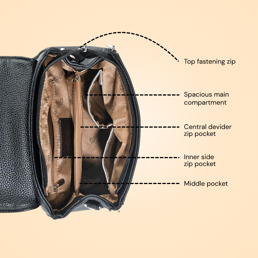 Interior:Â Spacious main compartment with inner zipper and slip pockets